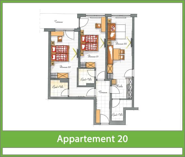 Unsere Ferienwohnung 20 für 4-6 Personen ist ebenerdig und liegt ebenfalls im Untergeschoss. Mit insgesamt 3 separaten Räumen, bestehend aus 3 Doppelzimmern und einem Wohnzimmer mit Küche und gemütlicher, großzügiger Essecke. Das Appartement hat 3 Bäder, jedes ausgestattet mit einer Dusche und WC. Jedes der 3 Schlafzimmer ist mit einem Flat-TV (Kabel-TV), einem Safe und natürlich gratis W-Lan ausgestattet. Das Wohnzimmer kann im Handumdrehen in ein vollwertiges Schlafzimmer mit Doppelbett verwandelt werden - Das Bett (180x200cm) ist hinter dem Sofa in der Wand versteckt und kann bei Tag auch weg geklappt werden.